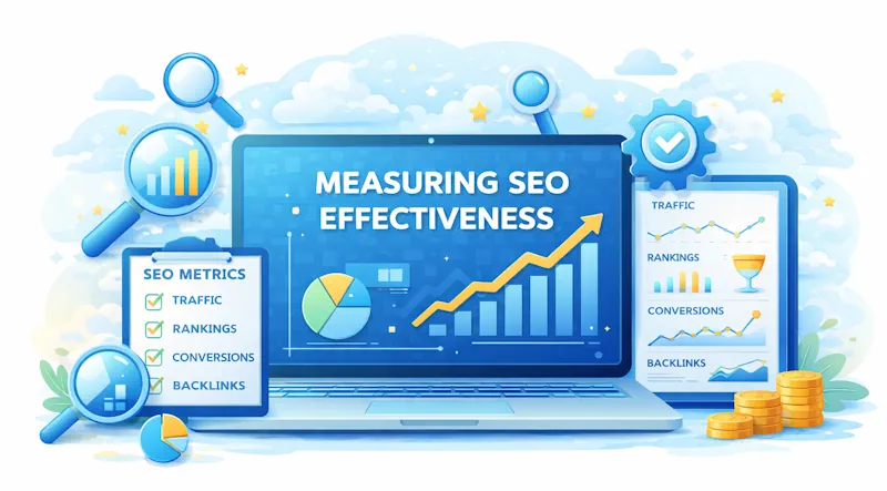 Эффективность оценивается по органическому трафику, позициям сайта по ключевым запросам, CTR, конверсиям, ссылочному профилю и показателям поведения пользователей (глубина просмотра, показатель отказов).